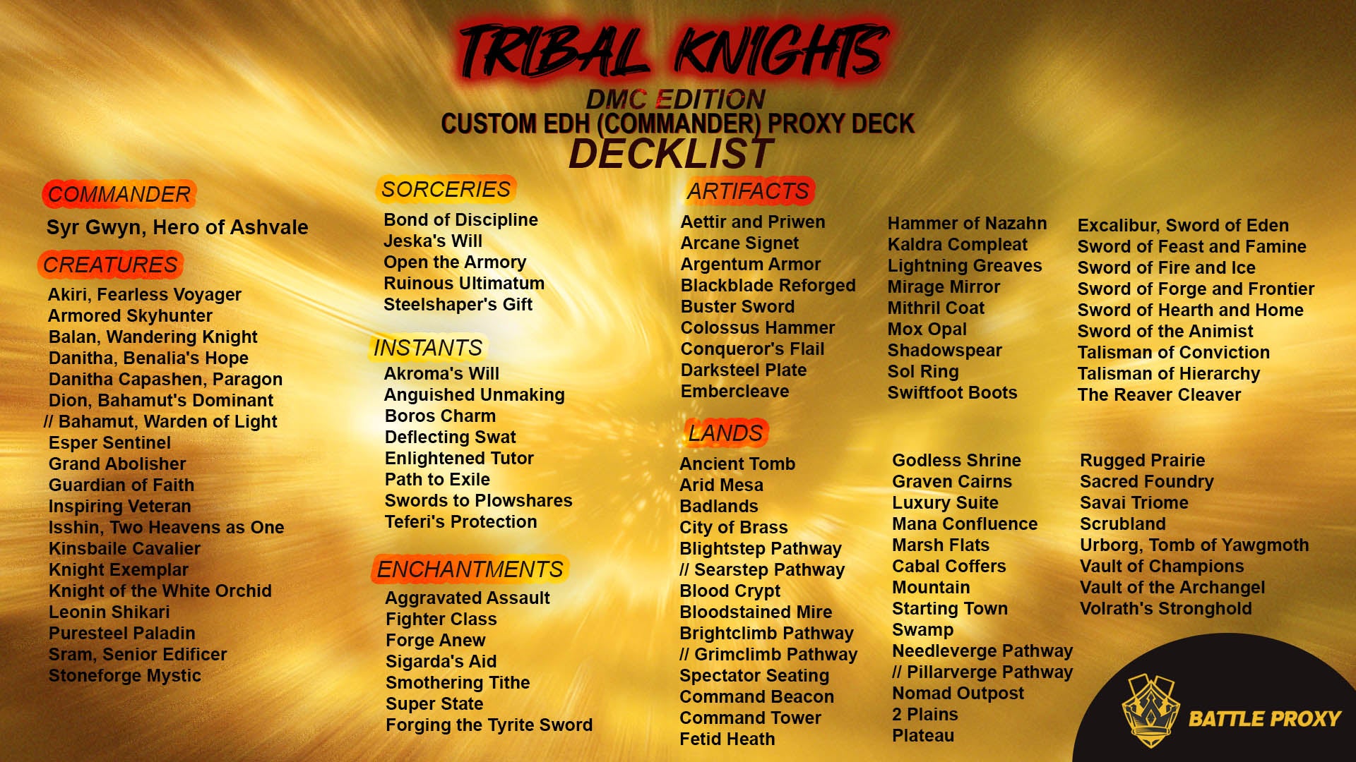 Build around Syr Gwyn, Hero of Ashvale, with this full custom EDH proxy deck, perfect for casual Commander play, testing, or expanding your MTG collection. Each card is a high-quality proxy with vibrant colors, sharp printing, and a tournament-style feel, indistinguishable in casual play.