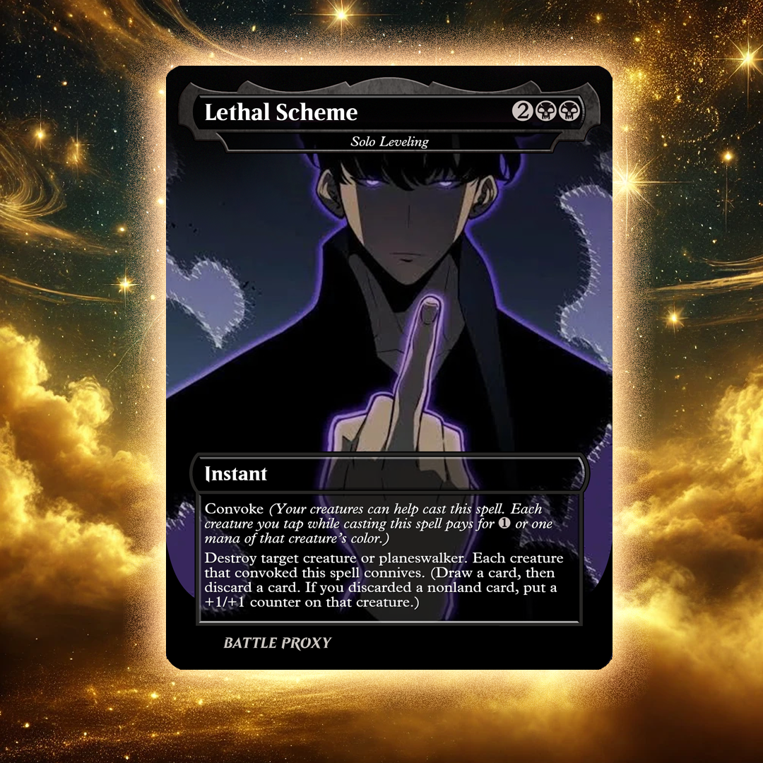 Check out our unique version of our Lethal Scheme proxy from Solo Leveling! It is not tournament legal. It is perfect for commanding players as long as your playgroup is ok with using proxies.